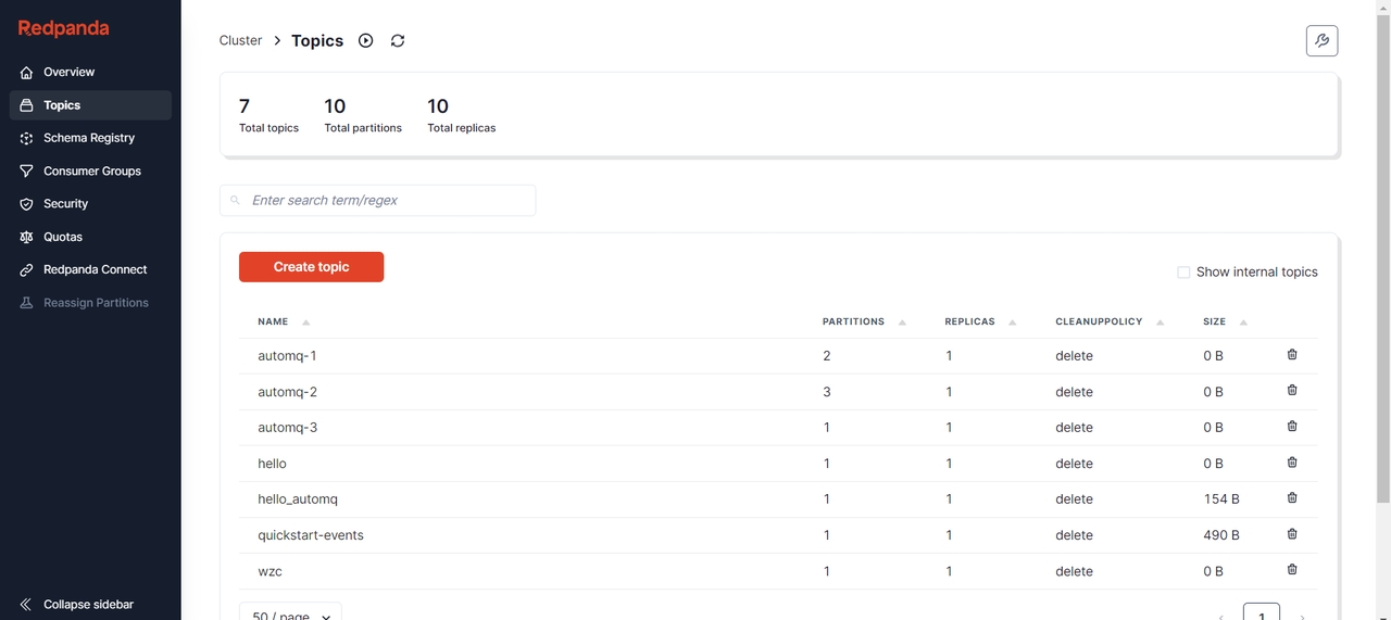 在 Topic 列表页面,用户可以看到当前 AutoMQ 集群中所有 Topic 的列表,包括每个 Topic 的关键信息,如分区数、副本策略等。用户可以通过这个页面快速浏览和管理 Topic。