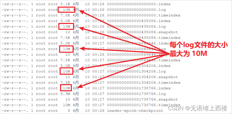 - 默认的每个日志文件最大为「log.segment.bytes =1024*1024*1024」1G