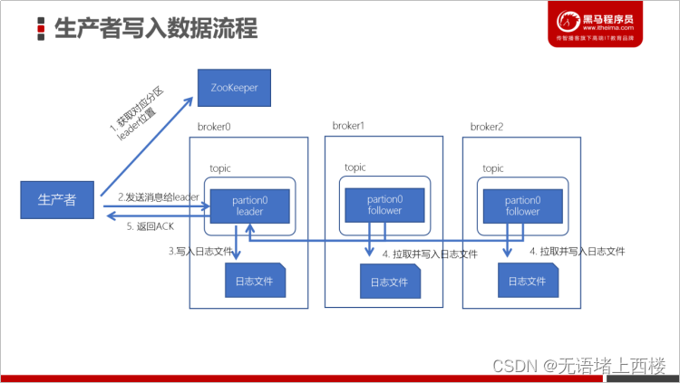 生产者先从 zookeeper 的 "/brokers/topics/主题名/partitions/分区名/state"节点找到该 partition 的leader
