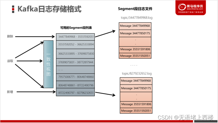- 一个分区(partition)由多个segment(段)组成