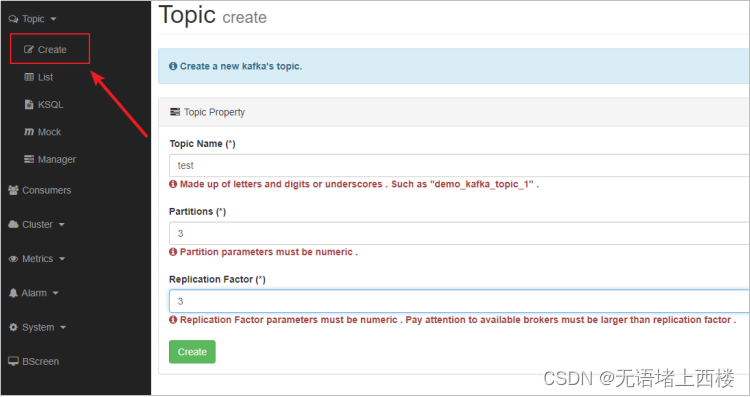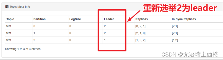 使用Kafka-eagle查看某个topic的partition的leader在哪个服务器中。为了方便观察,我们创建一个名为test的3个分区、3个副本的topic。