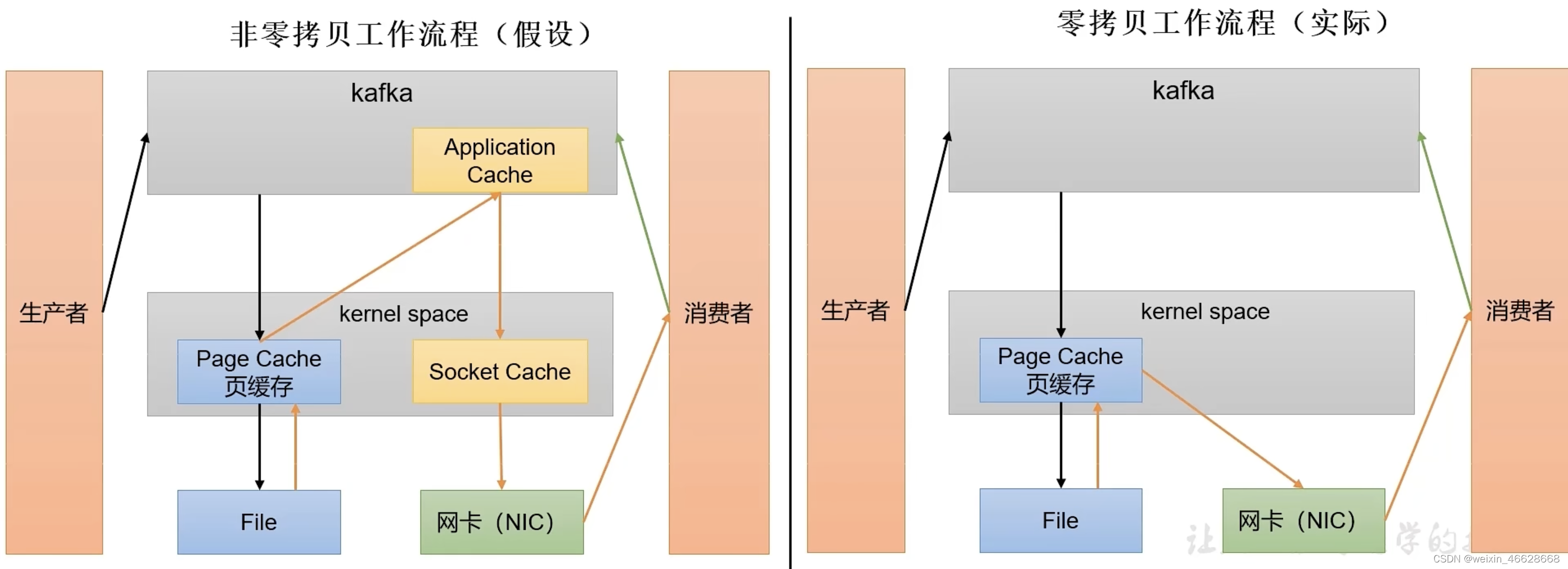 零拷贝:Kafka的数据加工处理操作交由Kafka生产者和消费者处理。Broker应用层不关心存储的数据,因此就不用走应用层,传输效率高。(传统数据复制方式:从磁盘中读取文件到内核缓冲区,内核读取缓冲区数据复制到用户缓冲区,用户缓冲区的数据复制到socket缓冲区,socket缓冲区数据发送到网卡,再到消费者)