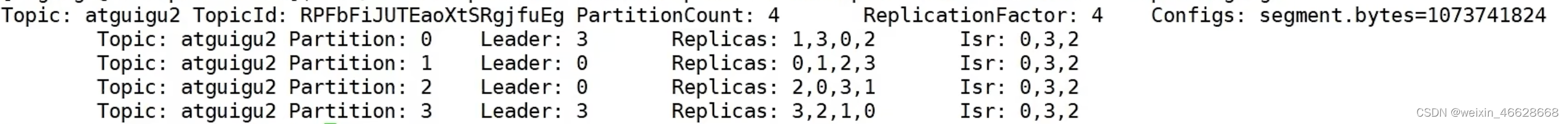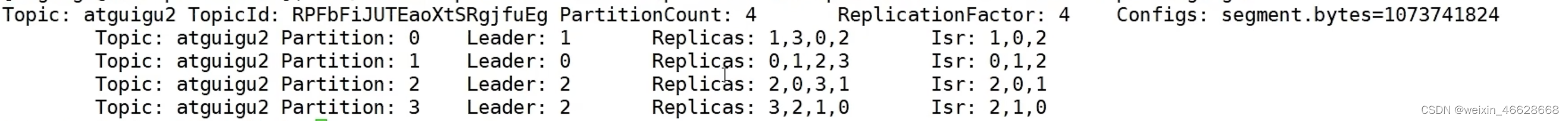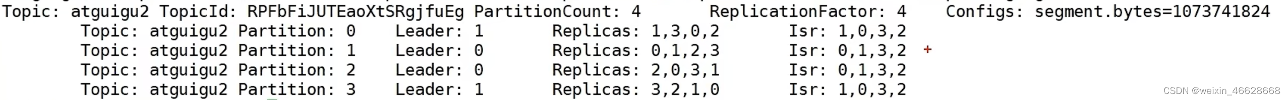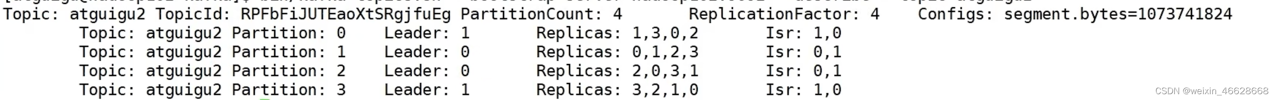如果服务器的存储能力不同,希望将数据更多的存储在空间大的服务器上,那么就不应该按照Kafka分区副本的默认均匀分配,而是需要手动调整。创建4个分区,两个副本,都存在0号和1号broker上面。