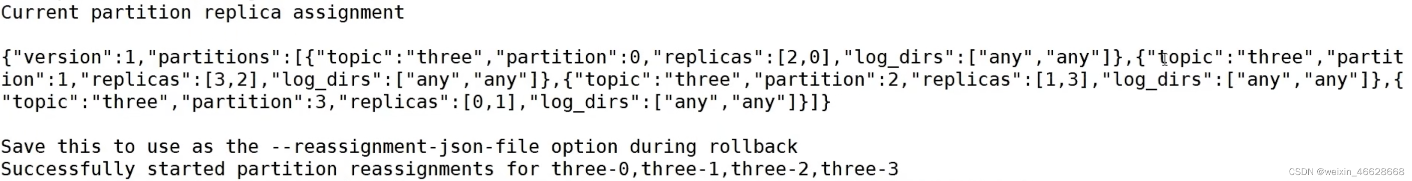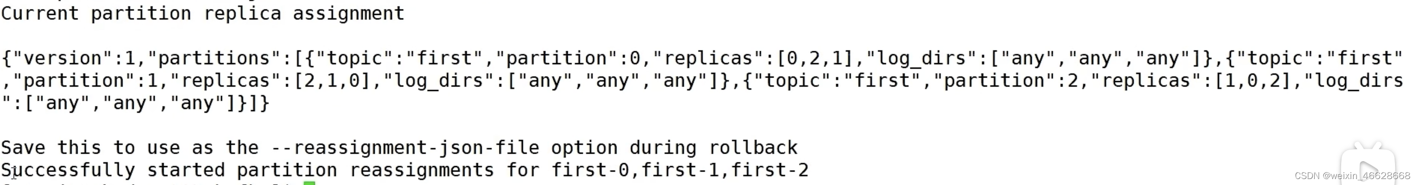 上面一行是当前的分区分配,下面一行是建议的分区分配计划,创建副本存储计划increase-replication-factor.json,里面内容是上面得到的建议计划。最后执行存储计划: