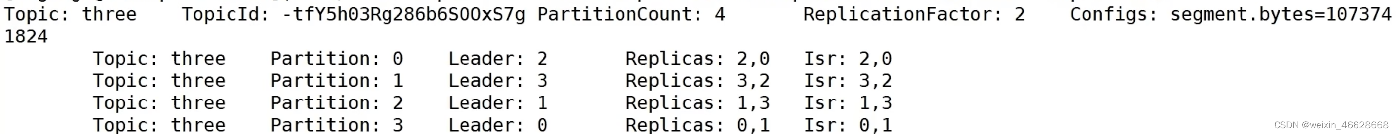 bin/kafka-topics.sh --bootstrap-server hadoop102:9092 --create --topic three --partitions 4 --replications-factor 2