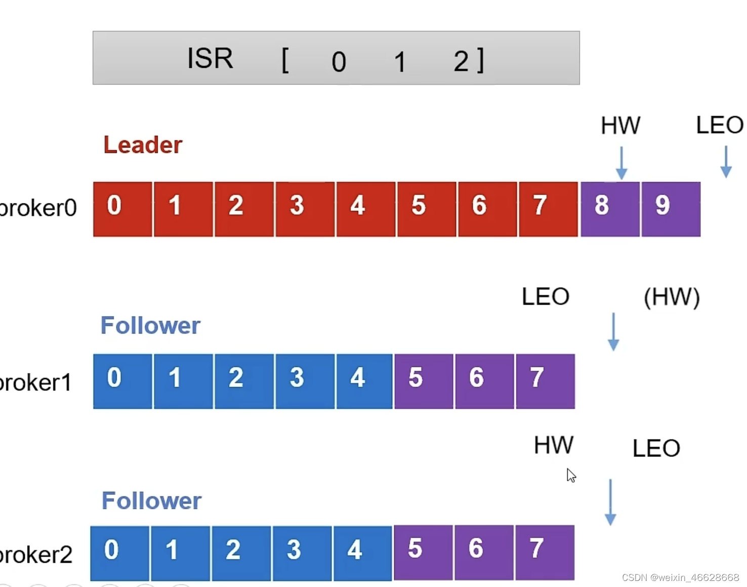 HW:high watermark,高水位线,所有副本中最小的LEO,消费者能够看到的最大的offset就是HW - 1