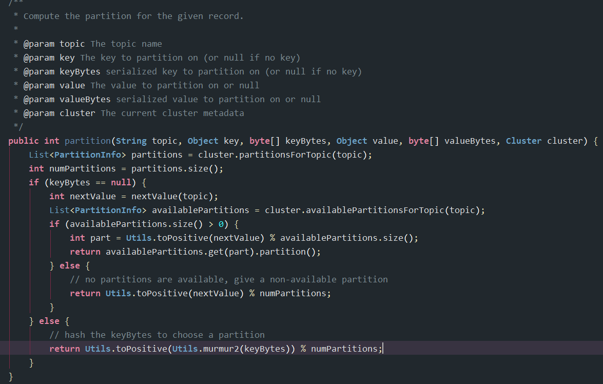 - 既没有指定partition,也没有key的情况下,第一次调用时随机生成一个整数(后面每次调用在这个整数上自增),将这个值与topic可用的partition数取余得到partition值,也就是常说的round-robin算法。