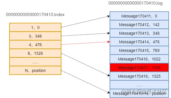 - 首先用二分查找确定它是在哪个Segment文件中,其中0000000000000000000.index为最开始的文件,第二个文件为0000000000000170410.index(起始偏移为170410+1 = 170411),而第三个文件为0000000000000239430.index(起始偏移为239430+1 = 239431)。所以这个offset = 170417就落在第二个文件中。其他后续文件可以依此类推,以起始偏移量命名并排列这些文件,然后根据二分查找法就可以快速定位到具体文件位置。