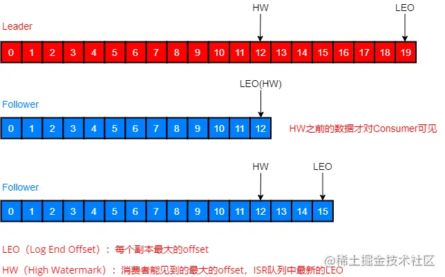 leader发生故障后,会从ISR中选出一个新的leader,之后为了保证多个副本之间的数据一致性,其余的follower会先将各自的log文件高于HW的部分截掉,然后从新的leader同步数据。