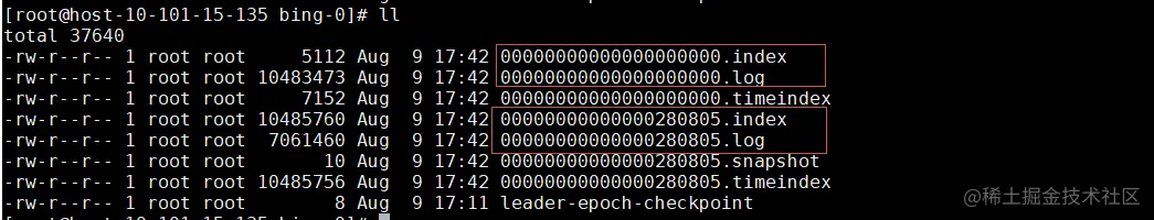 每个分区又被划分为多个日志分段 LogSegment 组成,日志段是 Kafka 日志对象分片的最小单位。LogSegment 算是一个逻辑概念,对应一个具体的日志文件(”.log” 的数据文件)和两个索引文件(”.index” 和 “.timeindex”,分别表示偏移量索引文件和消息时间戳索引文件)组成。