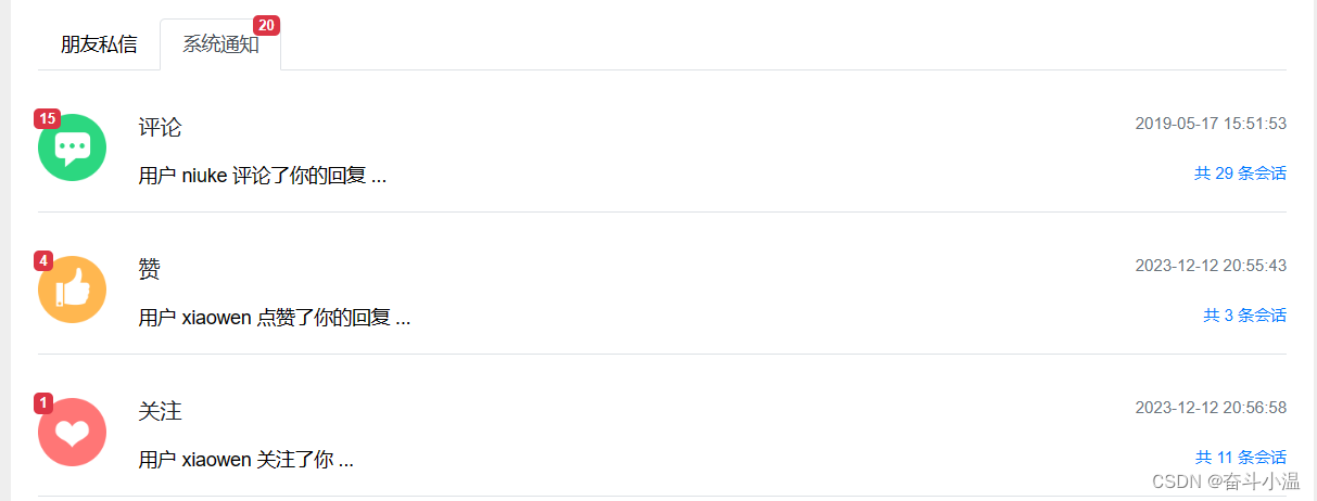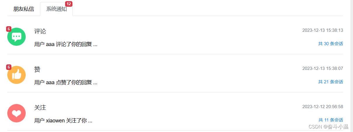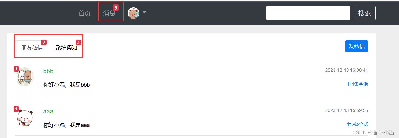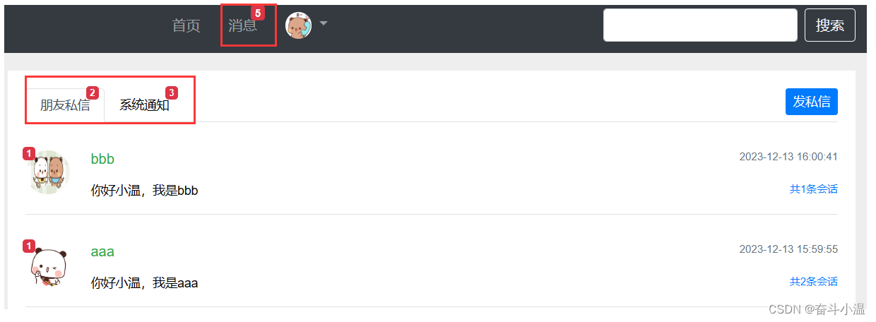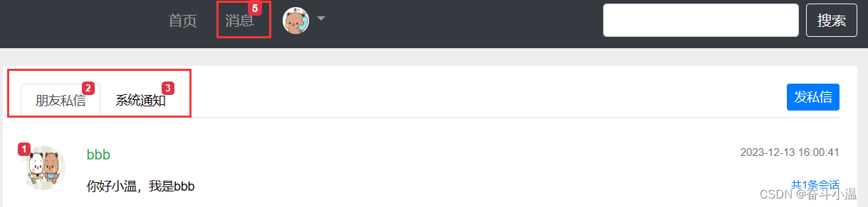 * 未读消息 = 朋友私信 + 系统通知(使用拦截器处理)