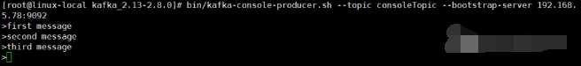 bin/kafka-console-producer.sh --topic consoleTopic --bootstrap-server 192.168.5.78:9092