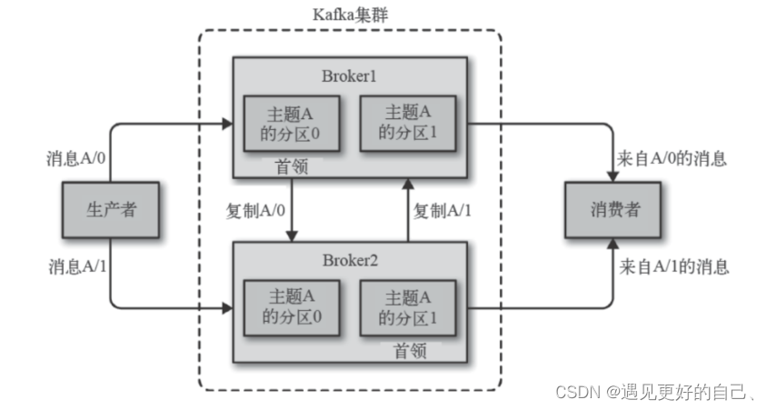- 首领以外的副本都是跟随者副本。跟随者副本不处理来自客户端的请求,它们唯一的任务就是从首领那里复制消息,保持与首领一致的状态。如果首领发生崩溃,其中的一个跟随者会被提升为新首领。