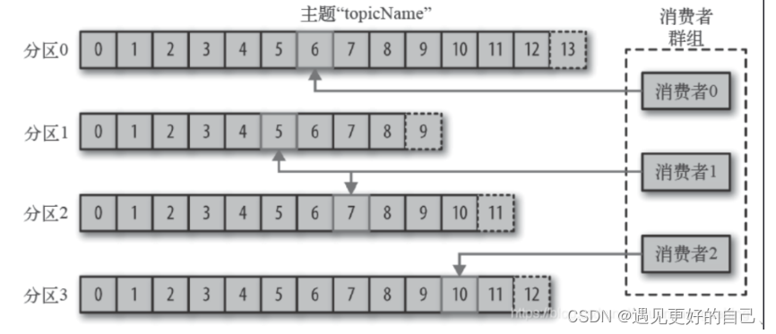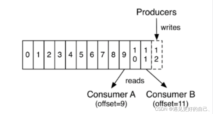 这是某一个分区的 offset 情况,生产者写入的 offset 是最新最大的值是12,而当 Consumer A 进行消费时,从 0 开始消费,一直消费到了 9,消费者的 offset 就记录在 9,Consumer B 就纪录在了 11。等下一次他们再来消费时,他们可以选择接着上一次的位置消费,当然也可以选择从头消费,或者跳到最近的记录并从“现在”开始消费。