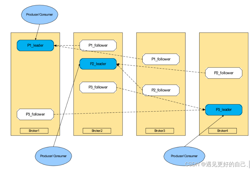 - 每个分区都有一个首领副本。为了保证一致性,所有生产者请求和消费者请求都会经过这个副本。