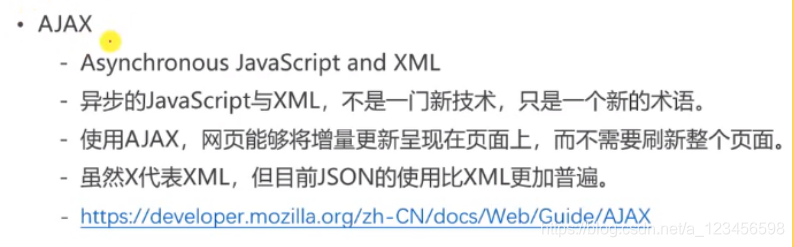 AJAX异步请求:当前网页不刷新,访问服务器,返回一个新的页面增量,对网页进行局部刷新。
