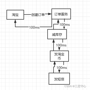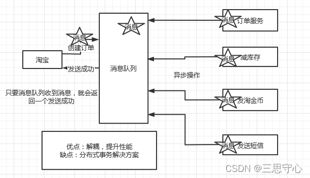 如果我们想买一个东西,那么需要经过以上的几个步骤,完成之后,才会给我们发送成功信号,消耗的时间是长的,并且十分容易引发错误,当网络波荡的时候,就会导致任务失败。