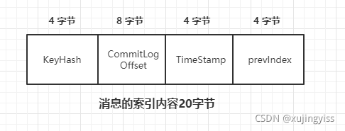 consumerqueue 中存储的内容是定长的,每条内容20个字节。commitLogOffset 8字节,msgSize 4字节,tagsCode 8字节。