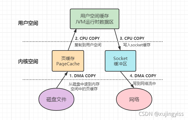 从图中可以看到,整个流程包含了4次拷贝,以及2次用户空间和内核空间的切换,比较耗费性能和CPU资源。零拷贝就是为了解决这种低效性。