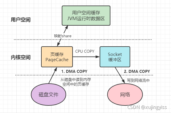 用户空间映射页缓存,通知页缓存直接将数据共享到 Socket 缓冲区,这样就避免了2次用户空间和内核空间的切换,并且少了两次拷贝。这样可以很大程度地提升磁盘 IO 的性能,可以大致接近内存的速度。