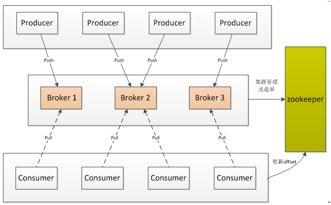 Kafka 通过 Zookeeper 管理集群配置、选举 leader,以及在 Consumer Group 发生变化时进行再平衡(rebalance)。Producer 使用 push 模式将消息发布到 broker,Consumer 使用 pull 模式从 broker 订阅并消费消息并更新消费的偏移量值(offset)。